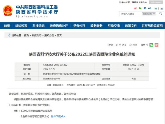 日前,陜西省科學技術廳公布了《陜西省科學技術廳關于公布2022年陜西省瞪羚企業名單的通知》(陜科函〔2022〕317號),根據陜西省瞪羚企業培育認定實施方案等規定,經屬地推薦、第三...